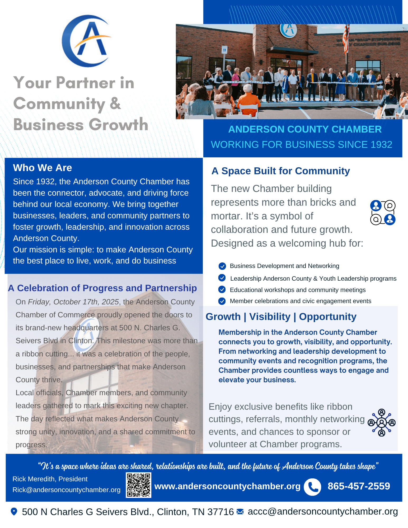 Whether you’re establishing a new business, seeking greater visibility, or looking to get more involved in the community, we invite you to experience all the Anderson County Chamber of Commerce has to offer. We are here to help you promote, support, and grow your business.